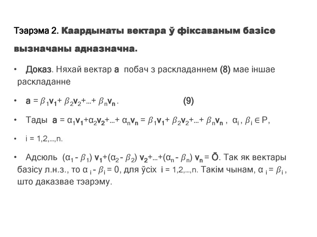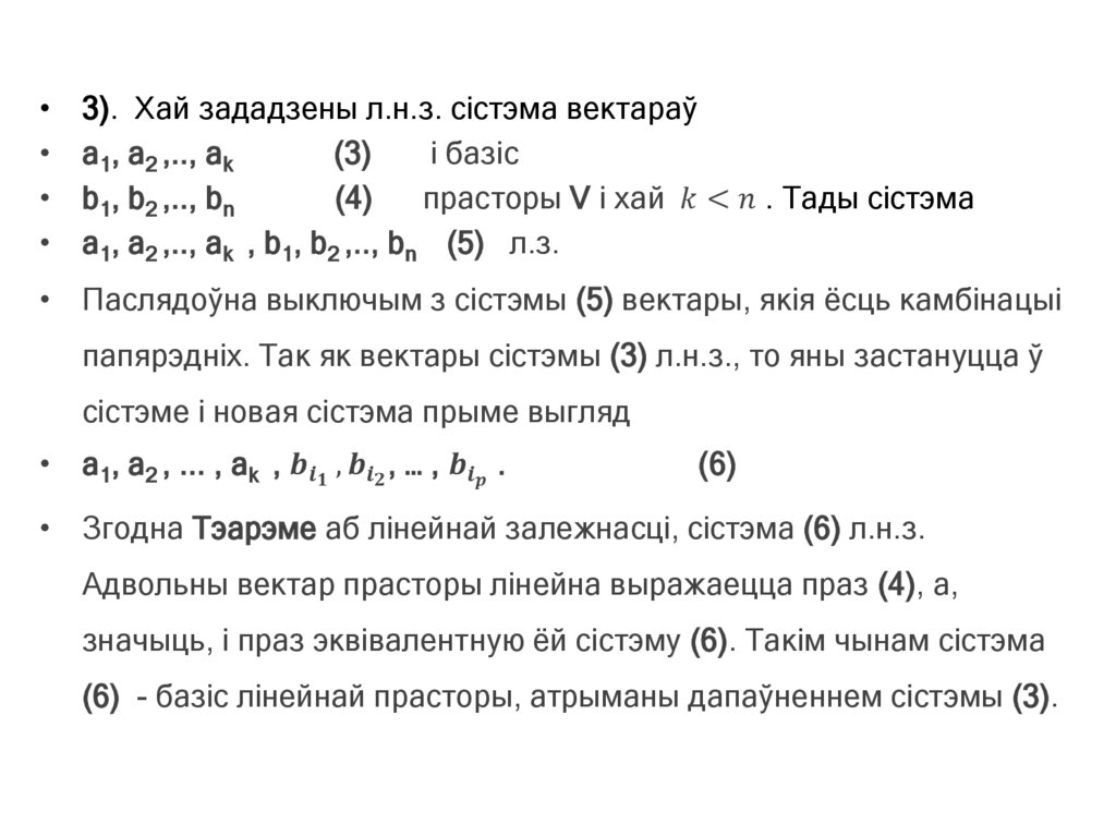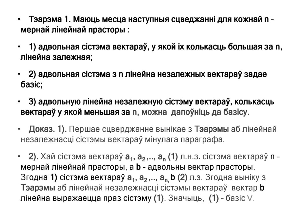 прасторы лінейна выражаецца праз гэты базіс. Згодна тэарэме мінулага