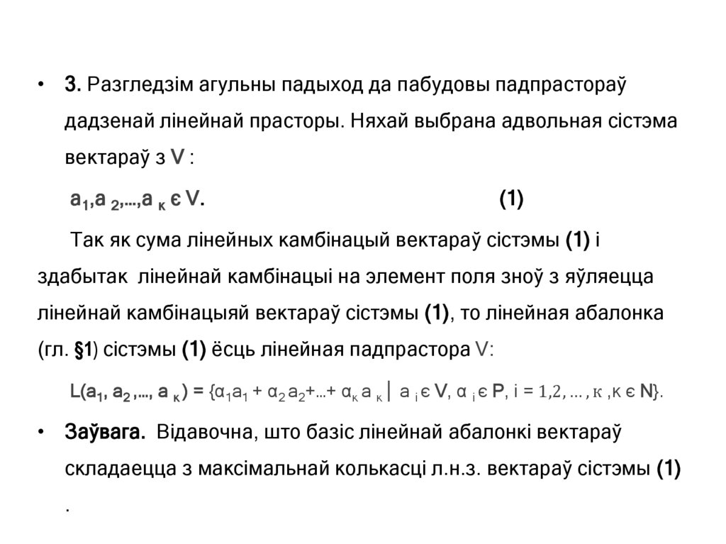 • 3. Разгледзім агульны падыход да пабудовы падпрастораўдадзенай лінейнай прасторы. Няхай выбрана адвольная сістэма