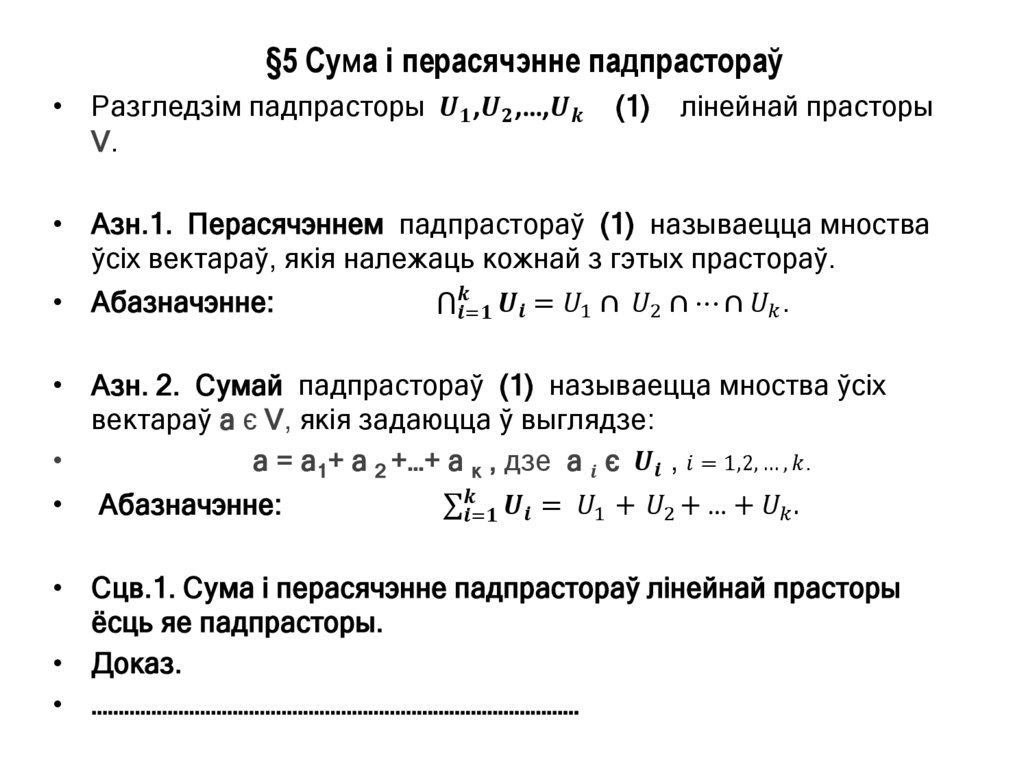 §5 Сума і перасячэнне падпрастораў• Разгледзім падпрасторы