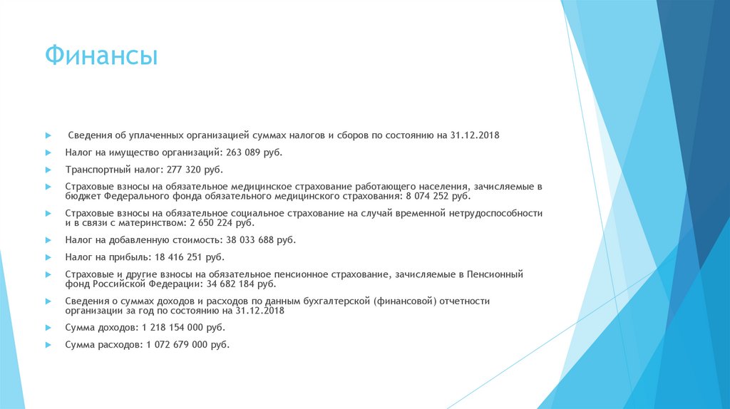 ФинансыСведения об уплаченных организацией суммах налогов и сборов по состоянию на 31.12.2018