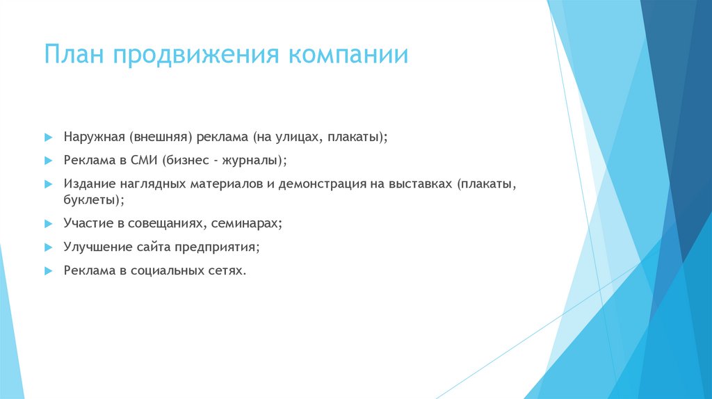 План продвижения компанииНаружная (внешняя) реклама (на улицах, плакаты);