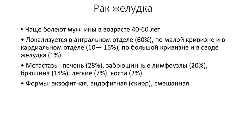 Рак желудка• Чаще болеют мужчины в возрасте 40-60 лет