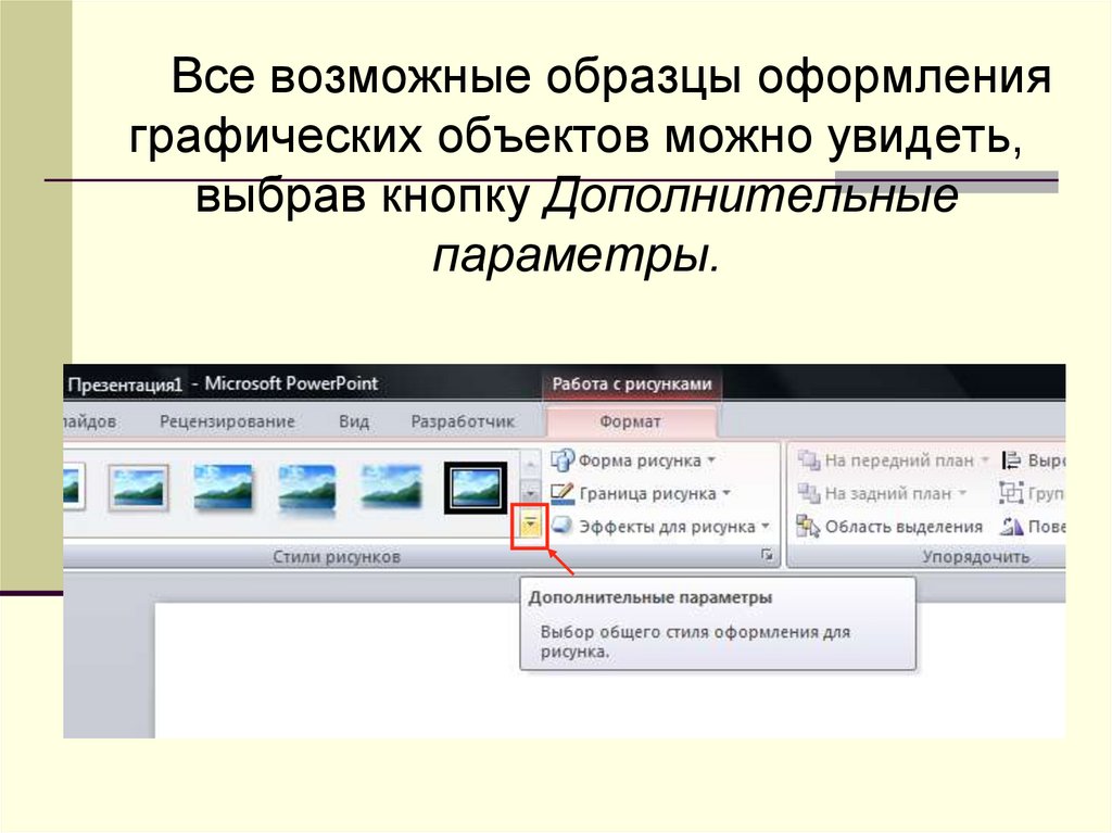 Все возможные образцы оформленияграфических объектов можно увидеть,