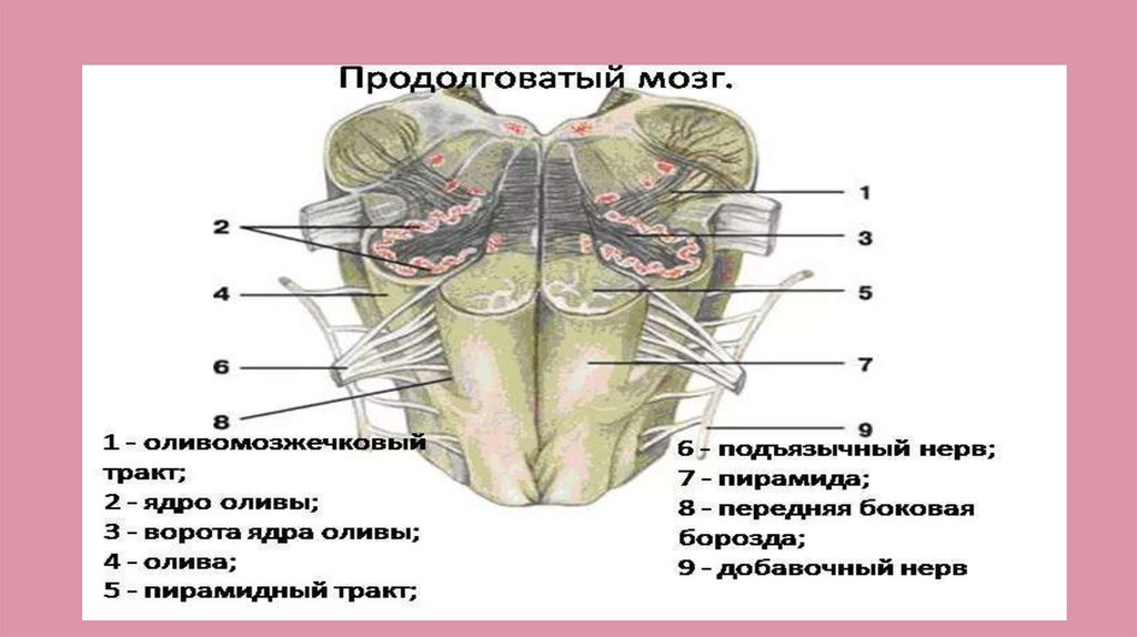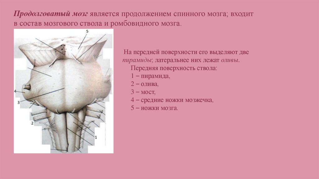 Продолговатый мозг является продолжением спинного мозга; входитв состав мозгового ствола и ромбовидного мозга.