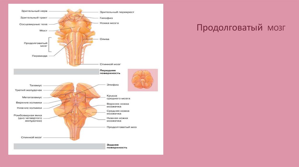 Продолговатый мозг является продолжением спинного мозга; входитв состав мозгового ствола и ромбовидного мозга.
