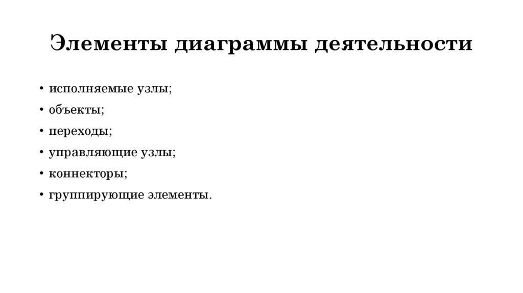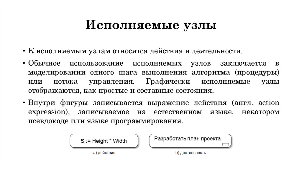 Исполняемые узлы• К исполняемым узлам относятся действия и деятельности.