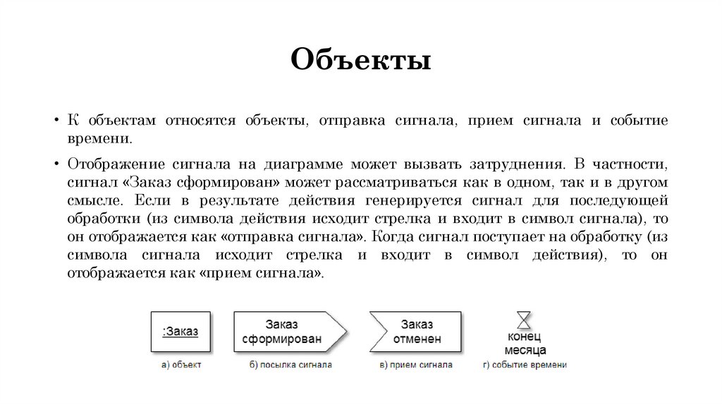 Объекты• К объектам относятся объекты, отправка сигнала, прием сигнала и событие