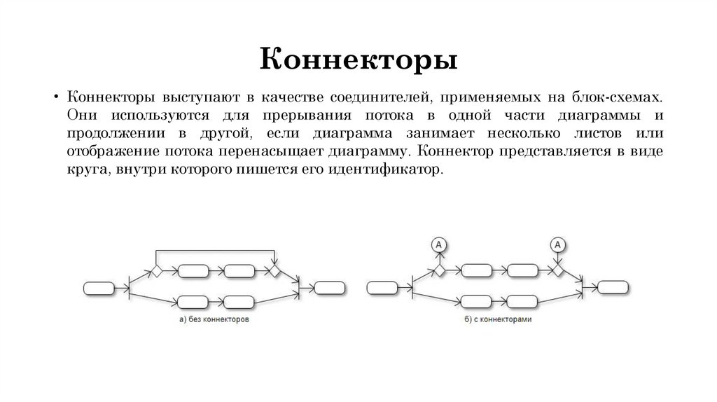 Коннекторы• Коннекторы выступают в качестве соединителей, применяемых на блок-схемах.
