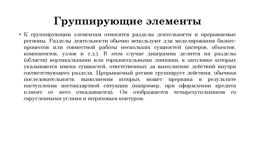 Группирующие элементы• К группирующим элементам относятся разделы деятельности и прерываемые