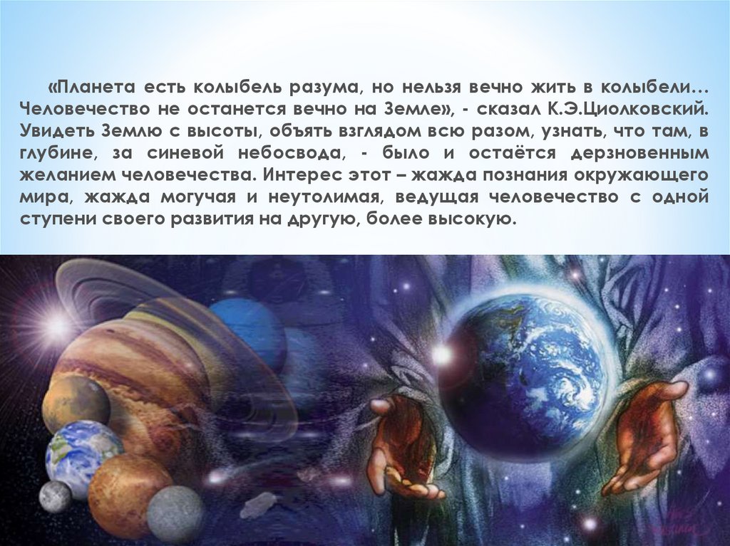 «Планета есть колыбель разума, но нельзя вечно жить в колыбели…Человечество не останется вечно на Земле», - сказал К.Э.Циолковский.