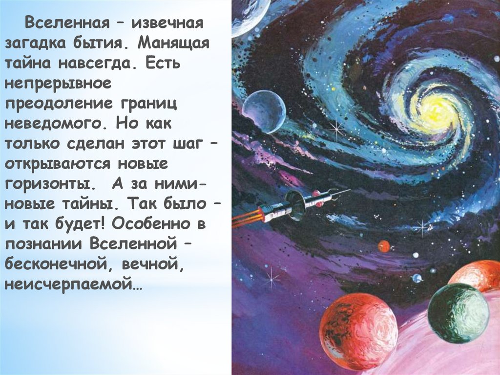 ВСЕЛЕННАЯ - извечная загадка бытия, манящая тайна навсегда. Ибонет конца у познания. Есть лишь непрерывное преодоление границ неведомого.
