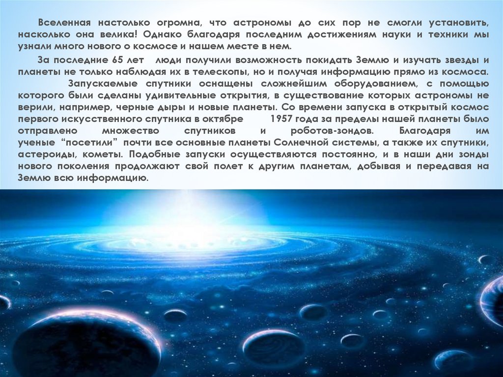 Вселенная настолько огромна, что астрономы до сих пор не смогли установить,насколько она велика! Однако благодаря последним достижениям науки и техники мы