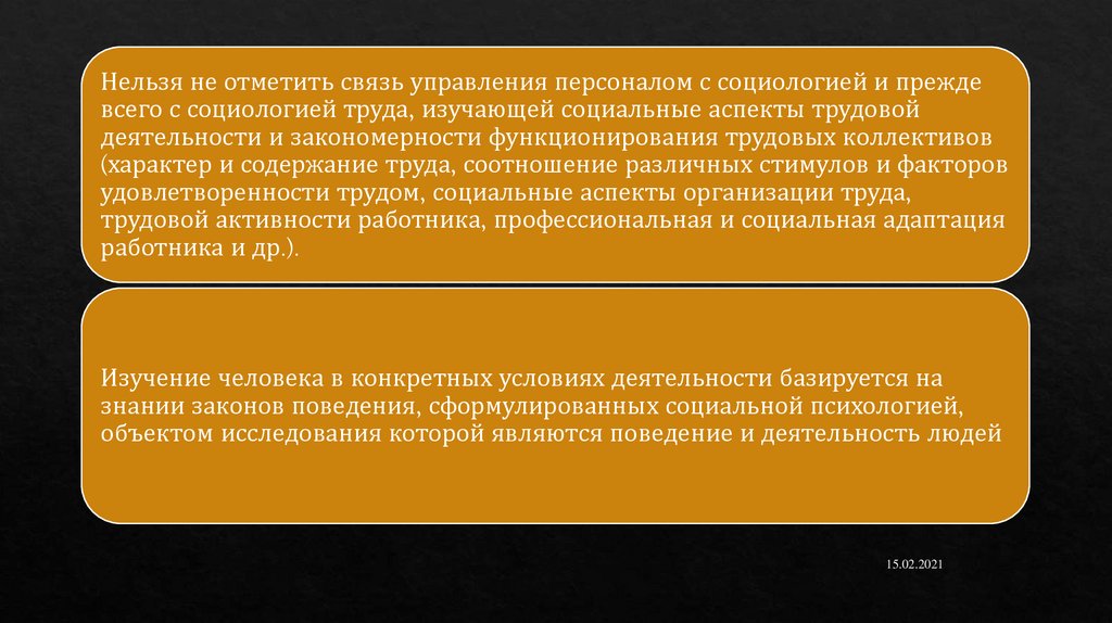 Нельзя не отметить связь управления персоналом с социологией и преждевсего с социологией труда, изучающей социальные аспекты трудовой
