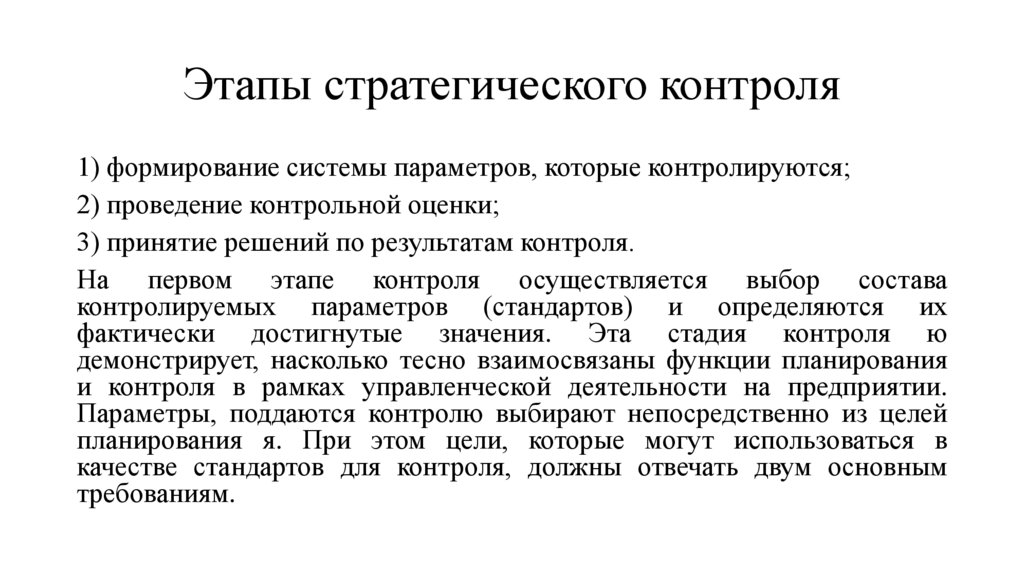 Этапы стратегического контроля1) формирование системы параметров, которые контролируются;