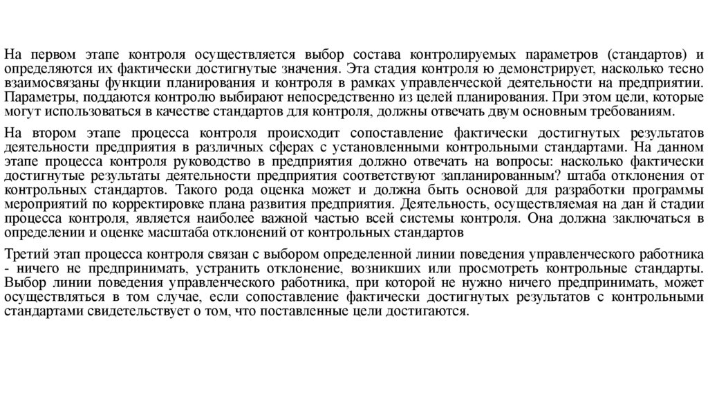 На первом этапе контроля осуществляется выбор состава контролируемых параметров (стандартов) иопределяются их фактически достигнутые значения. Эта стадия контроля ю демонстрирует, насколько тесно
