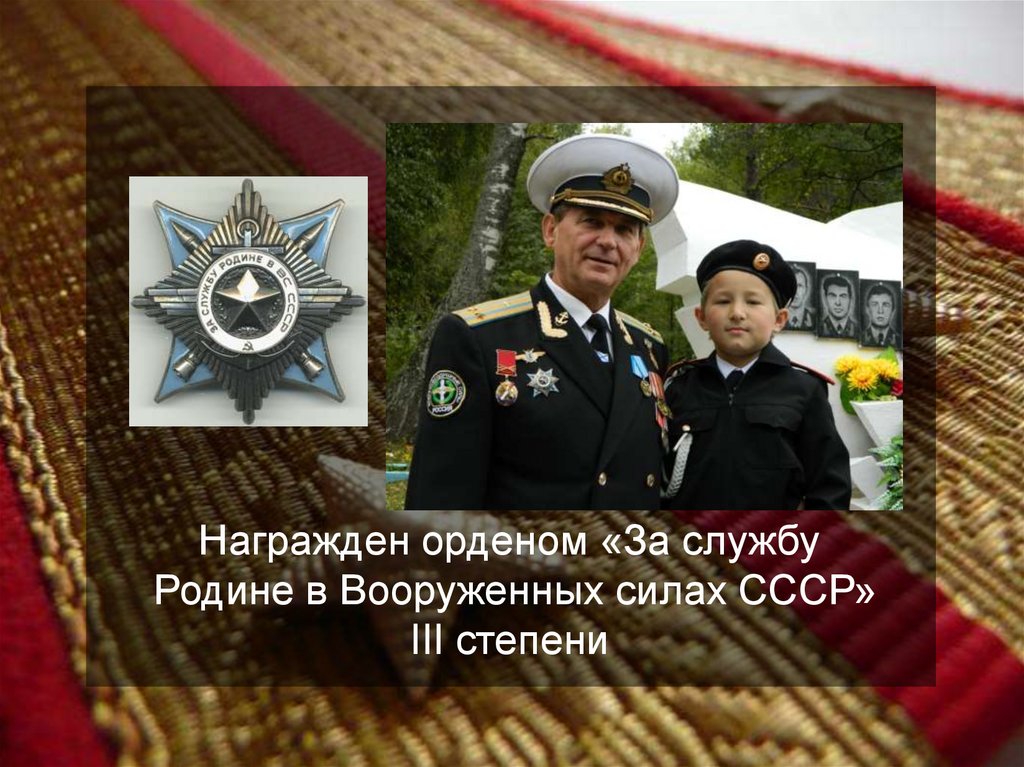 Награжден орденом «За службуРодине в Вооруженных силах СССР»