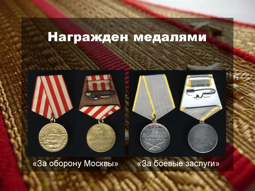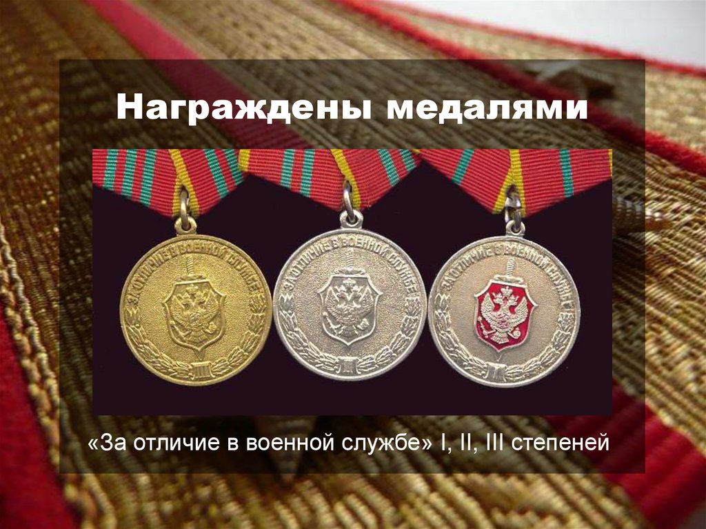Награждены медалями«За отличие в военной службе» I, II, III степеней