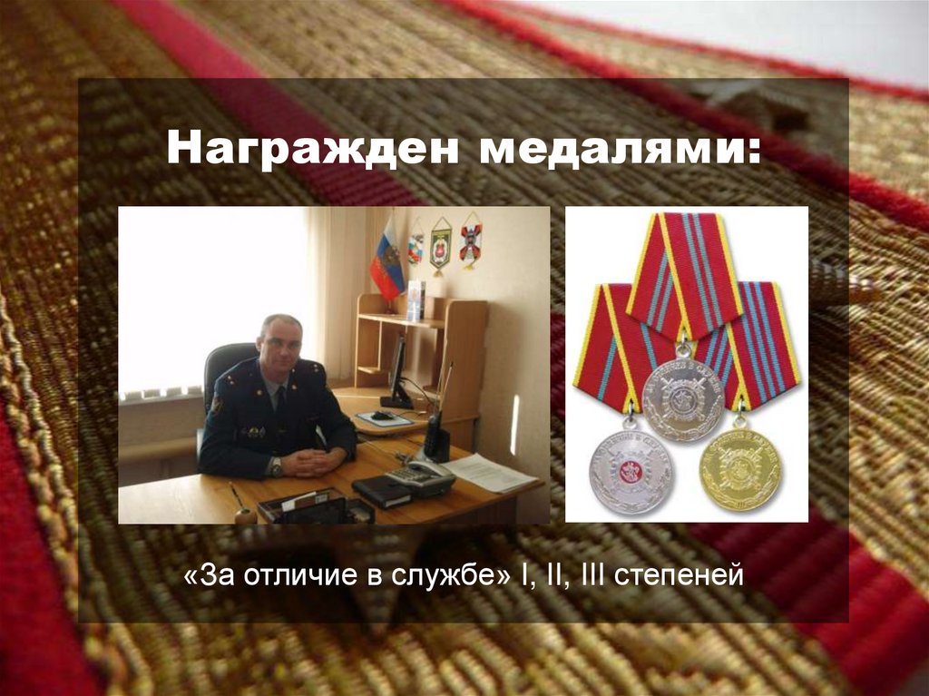 Награжден медалями:«За отличие в службе» I, II, III степеней