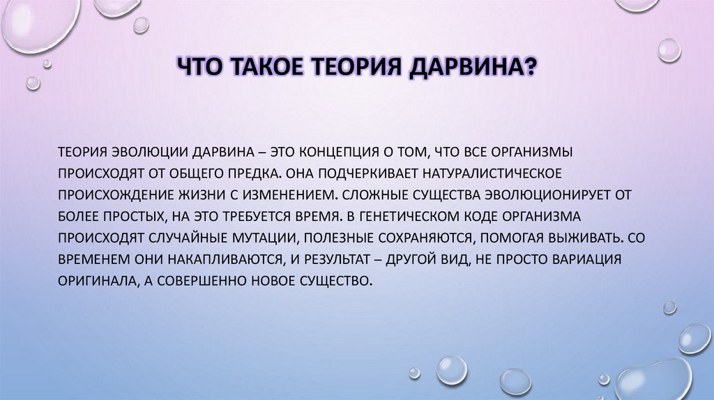ЧТО ТАКОЕ ТЕОРИЯ ДАРВИНА?ТЕОРИЯ ЭВОЛЮЦИИ ДАРВИНА – ЭТО КОНЦЕПЦИЯ О ТОМ, ЧТО ВСЕ ОРГАНИЗМЫ