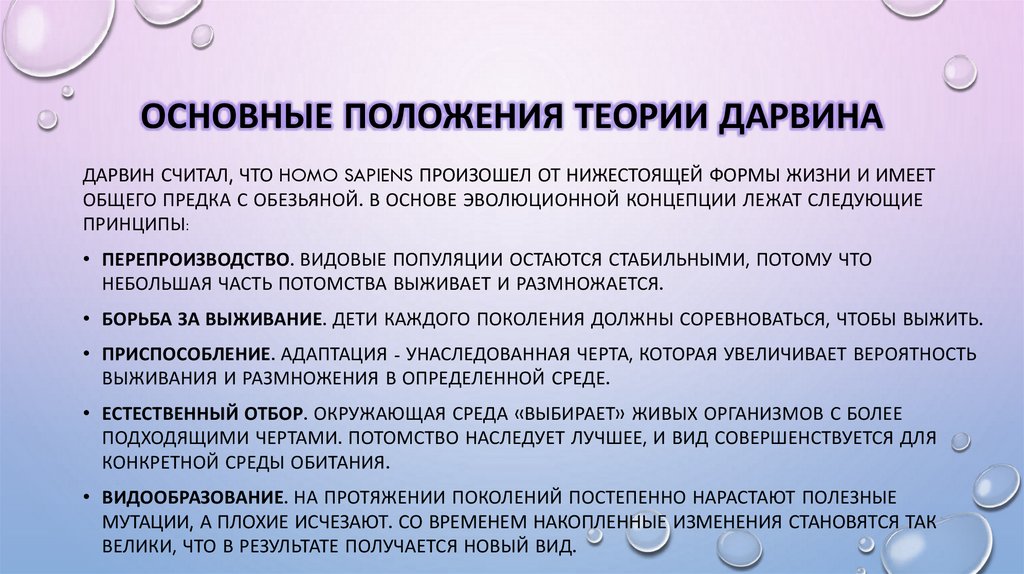 ОСНОВНЫЕ ПОЛОЖЕНИЯ ТЕОРИИ ДАРВИНАДАРВИН СЧИТАЛ, ЧТО HOMO SAPIENS ПРОИЗОШЕЛ ОТ НИЖЕСТОЯЩЕЙ ФОРМЫ ЖИЗНИ И ИМЕЕТ