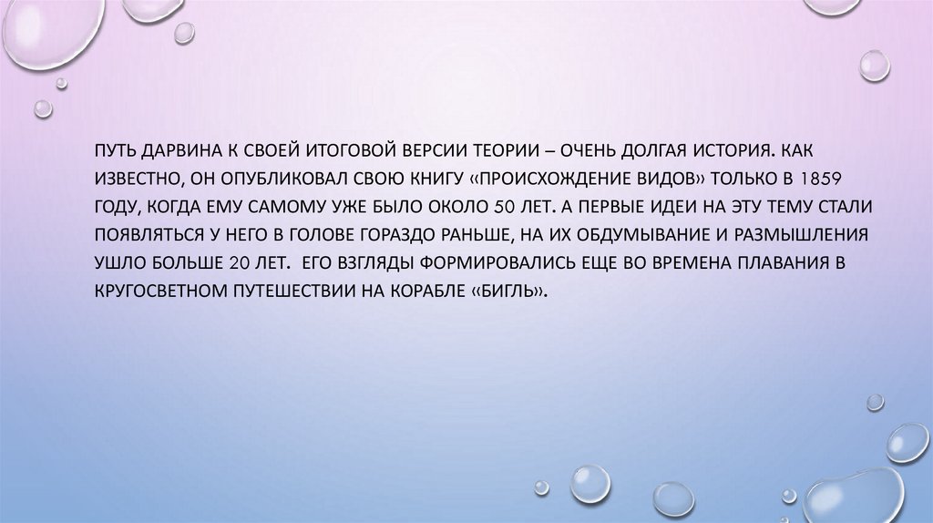 ПУТЬ ДАРВИНА К СВОЕЙ ИТОГОВОЙ ВЕРСИИ ТЕОРИИ – ОЧЕНЬ ДОЛГАЯ ИСТОРИЯ. КАКИЗВЕСТНО, ОН ОПУБЛИКОВАЛ СВОЮ КНИГУ «ПРОИСХОЖДЕНИЕ ВИДОВ» ТОЛЬКО В 1859