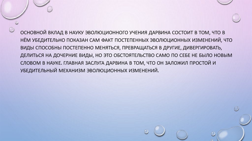 ОСНОВНОЙ ВКЛАД В НАУКУ ЭВОЛЮЦИОННОГО УЧЕНИЯ ДАРВИНА СОСТОИТ В ТОМ, ЧТО ВНЁМ УБЕДИТЕЛЬНО ПОКАЗАН САМ ФАКТ ПОСТЕПЕННЫХ ЭВОЛЮЦИОННЫХ ИЗМЕНЕНИЙ, ЧТО