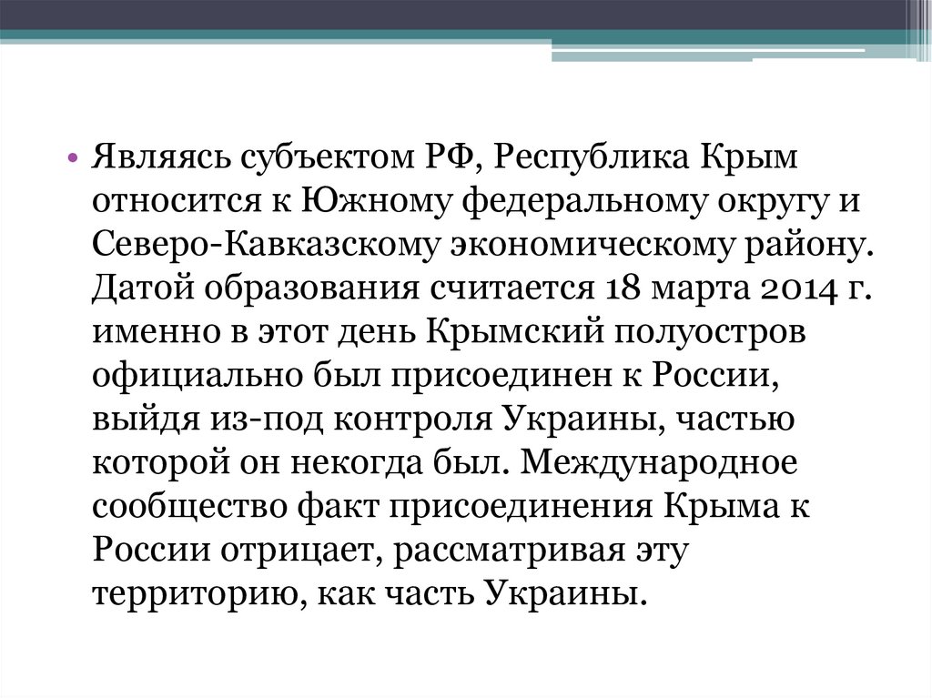 • Являясь субъектом РФ, Республика Крымотносится к Южному федеральному округу и