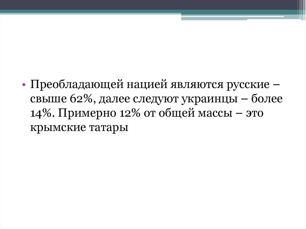 • Преобладающей нацией являются русские –свыше 62%, далее следуют украинцы – более