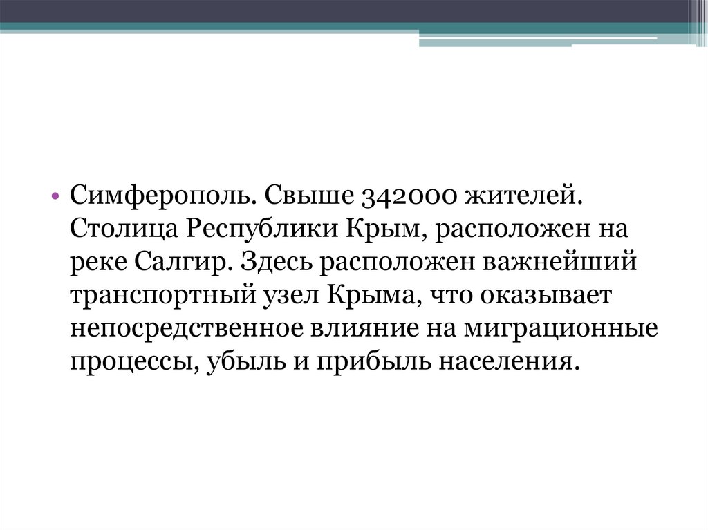 • Симферополь. Свыше 342000 жителей.Столица Республики Крым, расположен на
