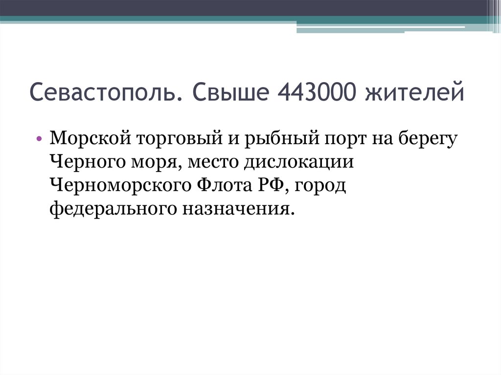Севастополь. Свыше 443000 жителей• Морской торговый и рыбный порт на берегу