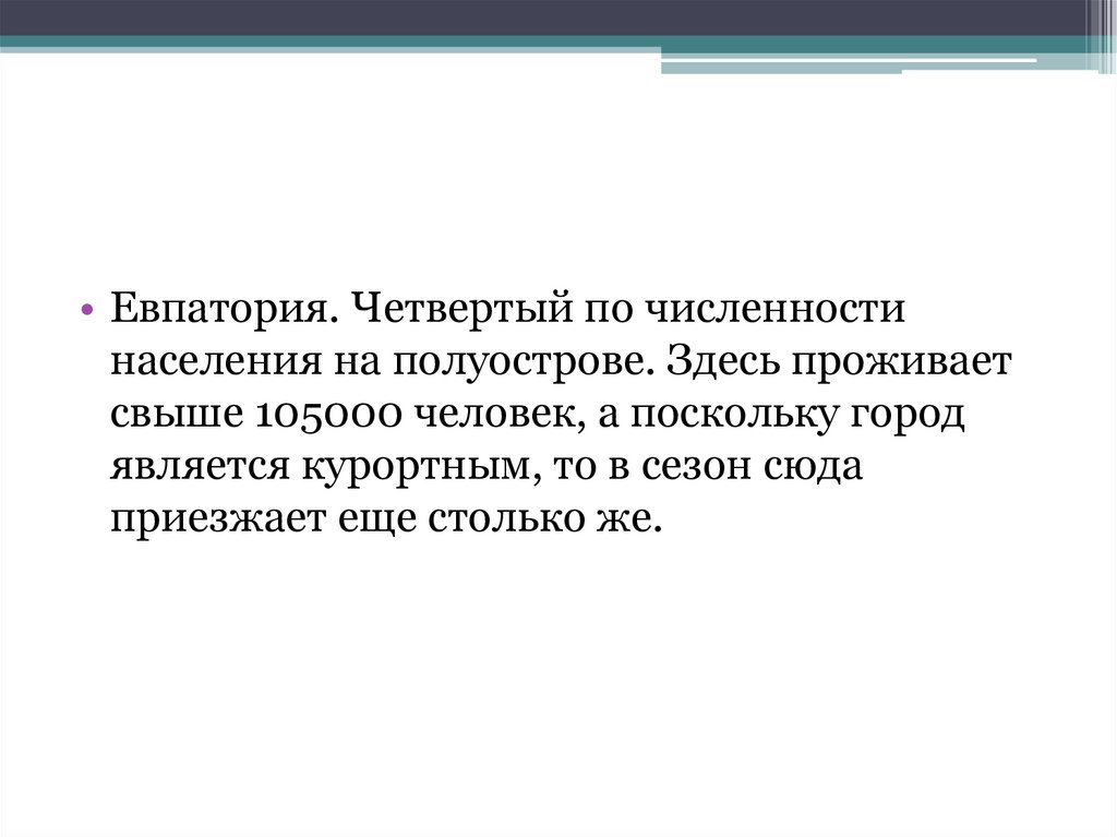 • Евпатория. Четвертый по численностинаселения на полуострове. Здесь проживает