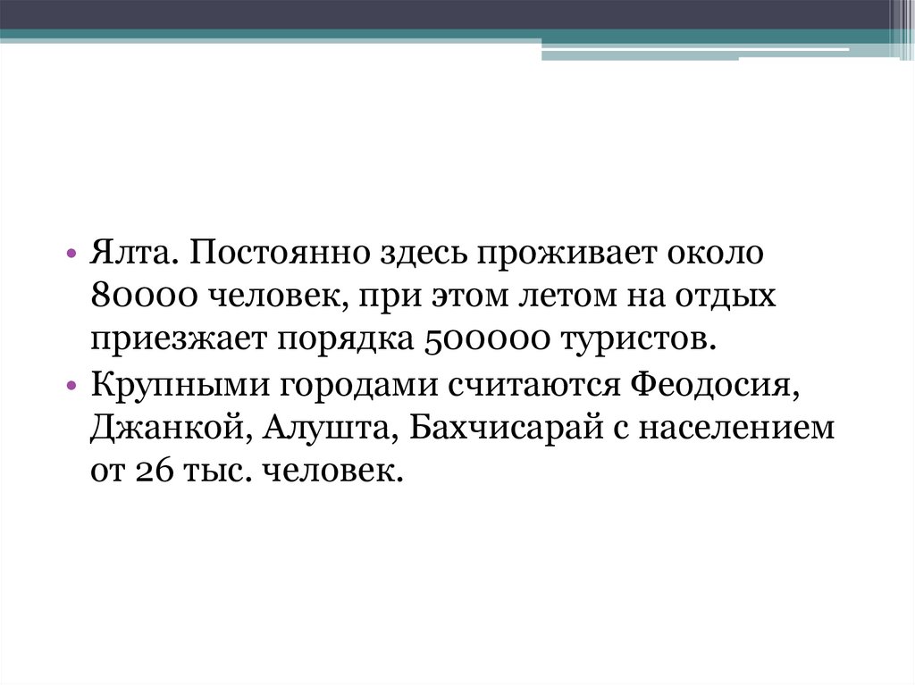 • Ялта. Постоянно здесь проживает около80000 человек, при этом летом на отдых
