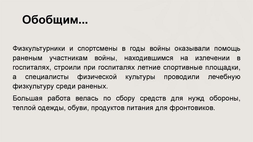 Обобщим...Физкультурники и спортсмены в годы войны оказывали помощь