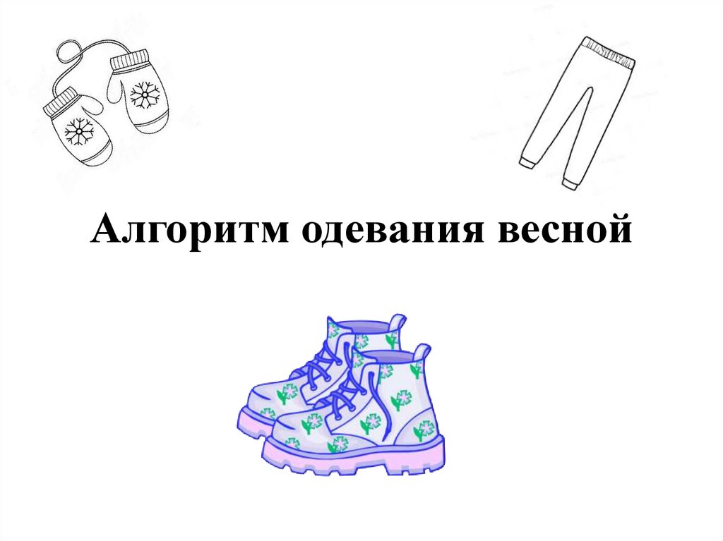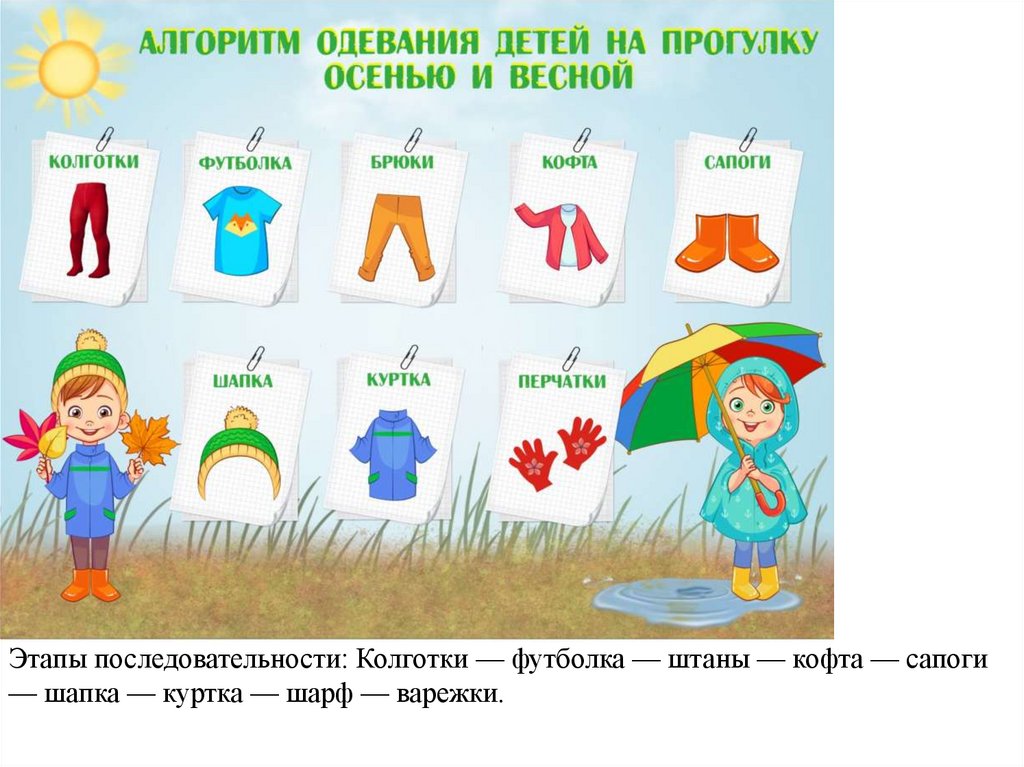 Этапы последовательности: Колготки — футболка — штаны — кофта — сапоги— шапка — куртка — шарф — варежки.