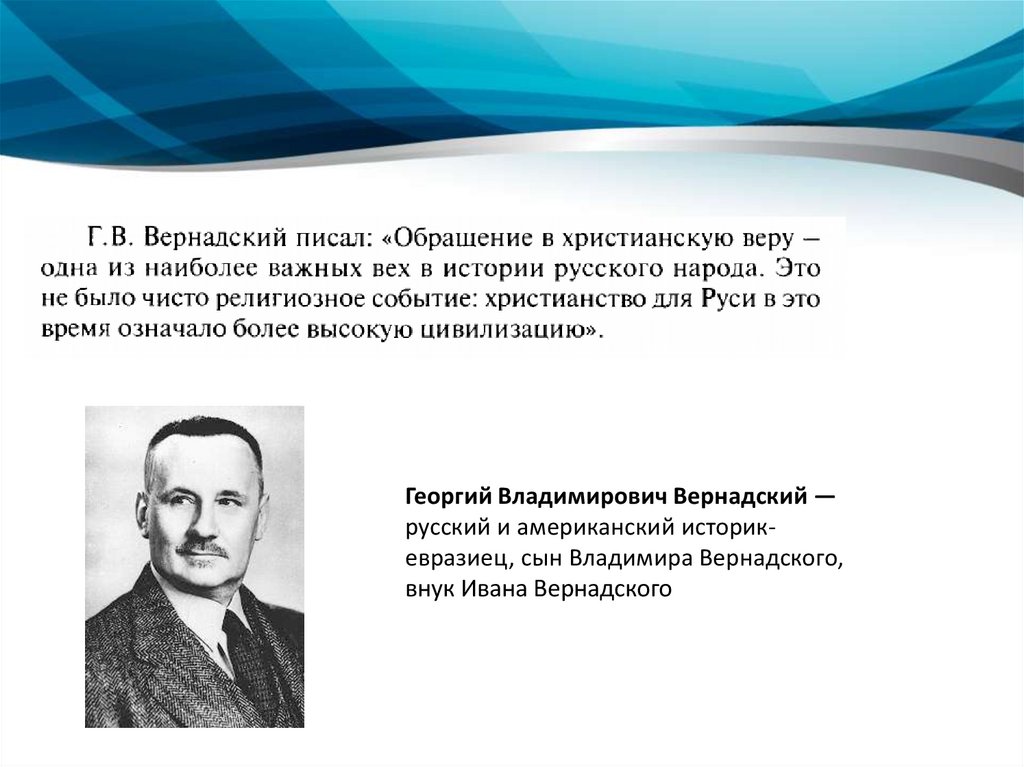 Георгий Владимирович Вернадский —русский и американский историкевразиец, сын Владимира Вернадского,