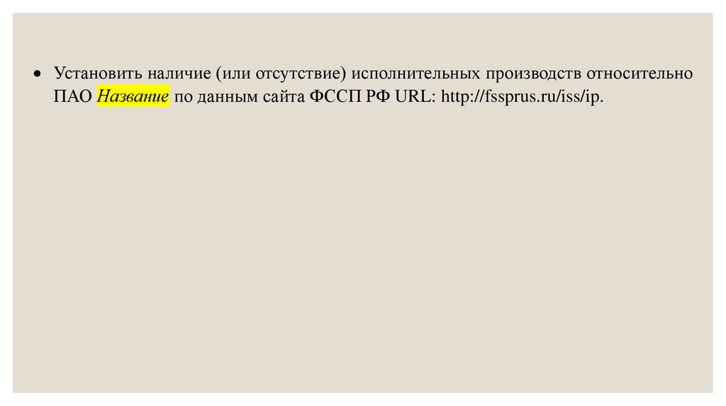 Установить наличие (или отсутствие) исполнительных производств относительноПАО Название по данным сайта ФССП РФ URL: http://fssprus.ru/iss/ip.