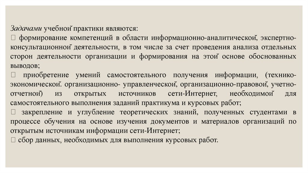 Задачами учебной практики являются:формирование компетенций в области информационно-аналитической, экспертноконсультационной деятельности, в том числе за счет проведения анализа отдельных