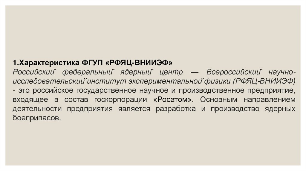1.Характеристика ФГУП «РФЯЦ-ВНИИЭФ»Российский федеральный ядерный центр — Всероссийский научноисследовательский институт экспериментальной физики (РФЯЦ-ВНИИЭФ)