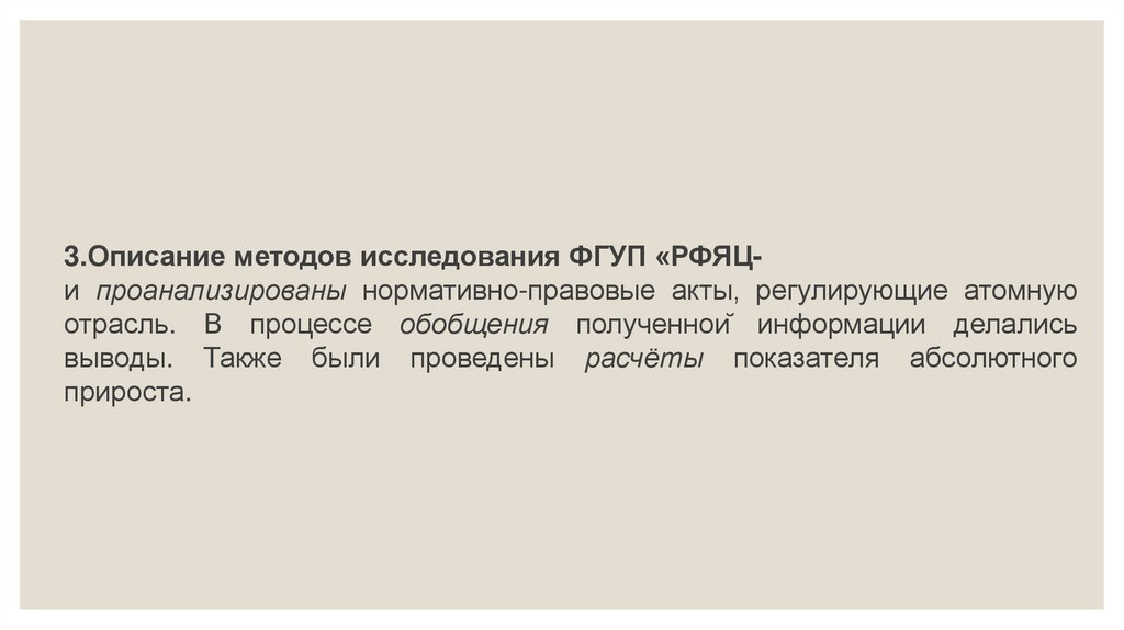 3.Описание методов исследования ФГУП «РФЯЦи проанализированы нормативно-правовые акты, регулирующие атомнуюотрасль. В процессе обобщения полученной информации делались