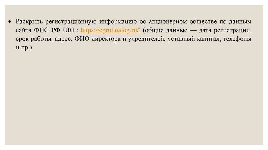 Раскрыть регистрационную информацию об акционерном обществе по даннымсайта ФНС РФ URL: https://egrul.nalog.ru/' (общие данные — дата регистрации,