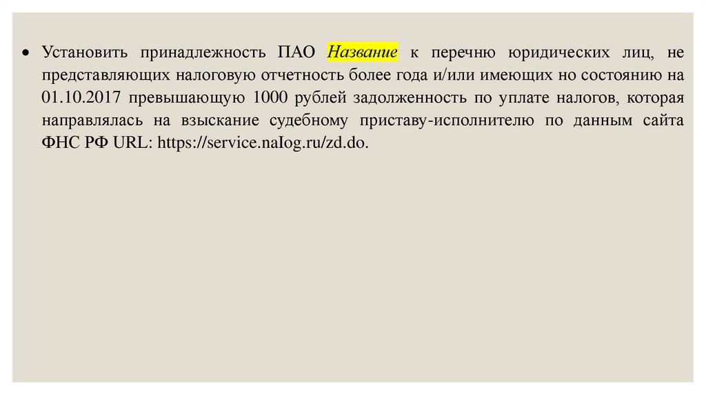 Установить принадлежность ПАО Название к перечню юридических лиц, непредставляющих налоговую отчетность более года и/или имеющих но состоянию на