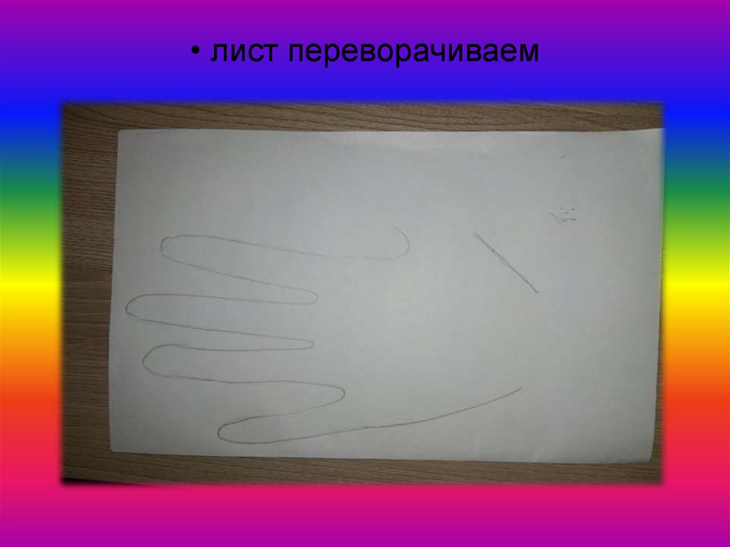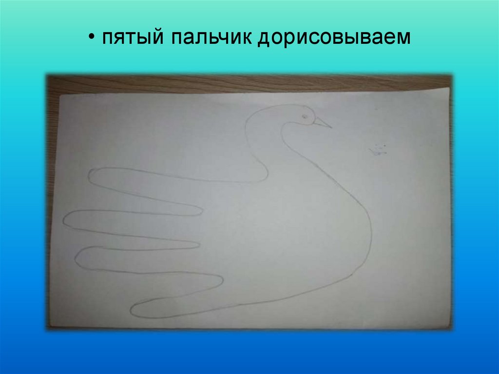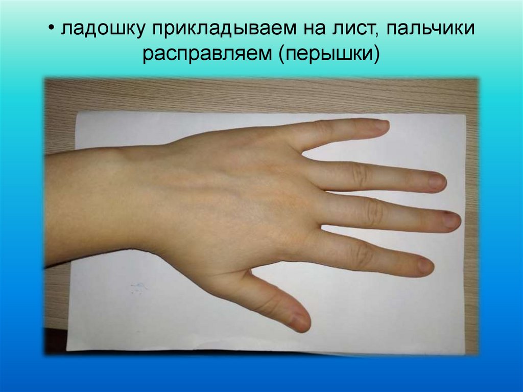 • ладошку прикладываем на лист, пальчикирасправляем (перышки)