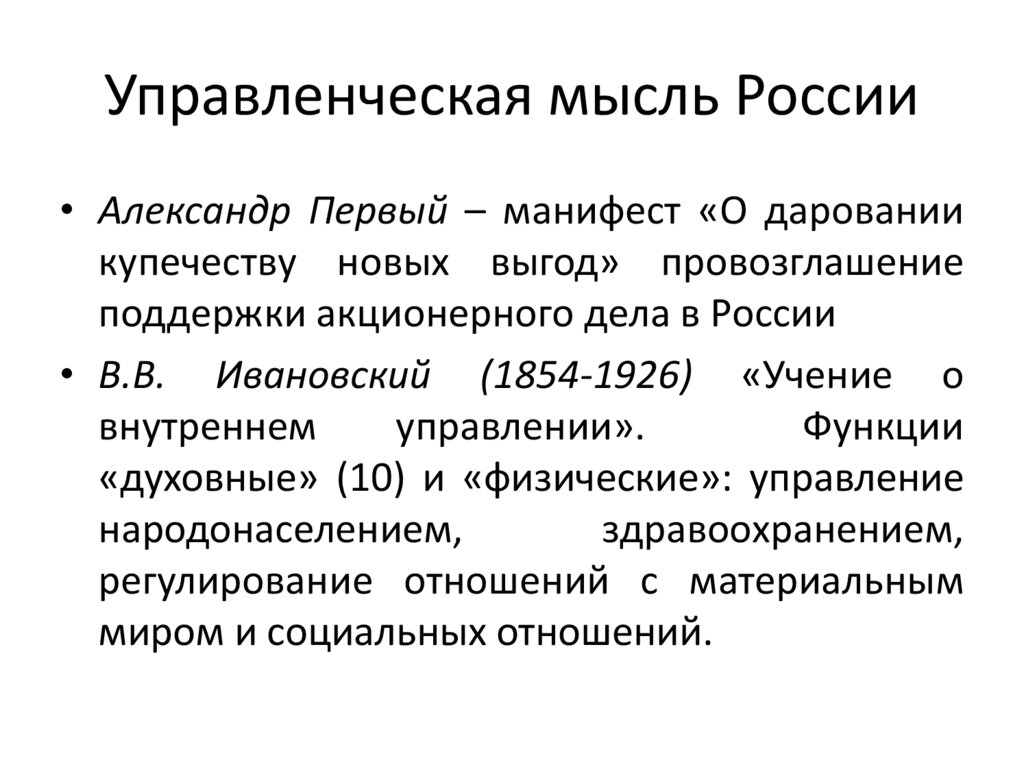 Управленческая мысль России• Александр Первый – манифест «О даровании