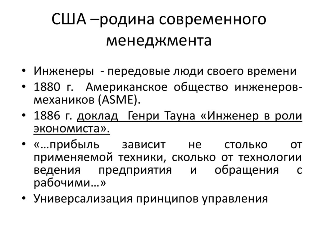 • 1886 г. доклад Генри Тауна «Инженер в роли