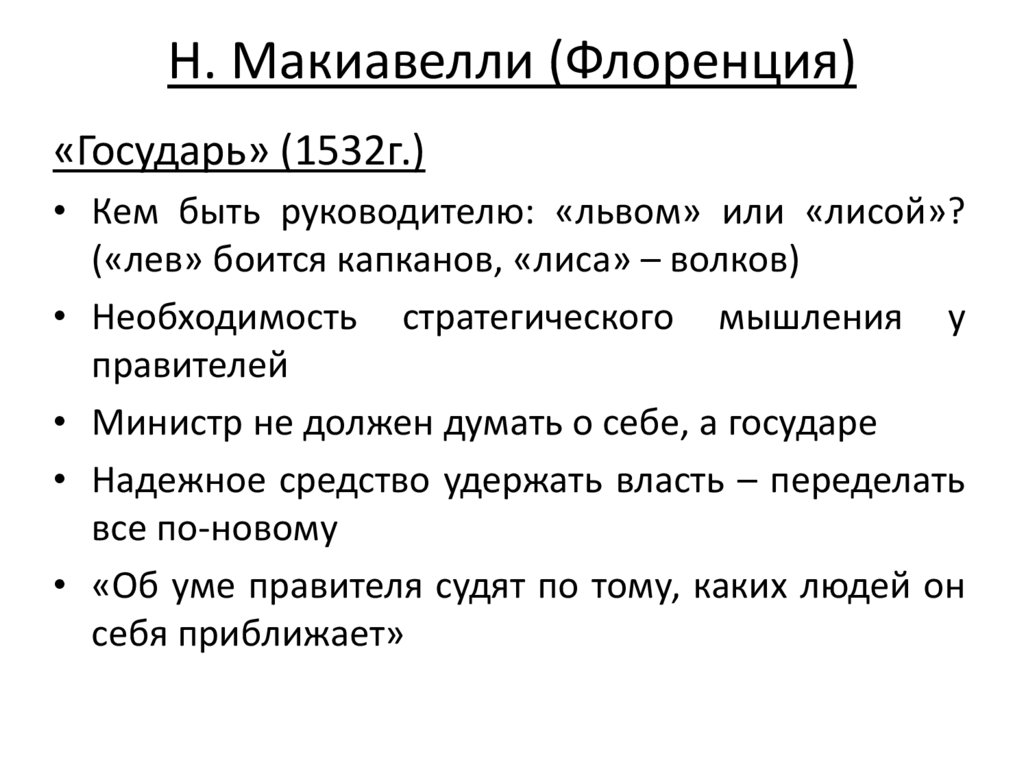 Н. Макиавелли (Флоренция)«Государь» (1532г.)