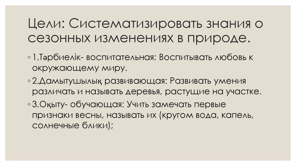 Цели: Систематизировать знания осезонных изменениях в природе.