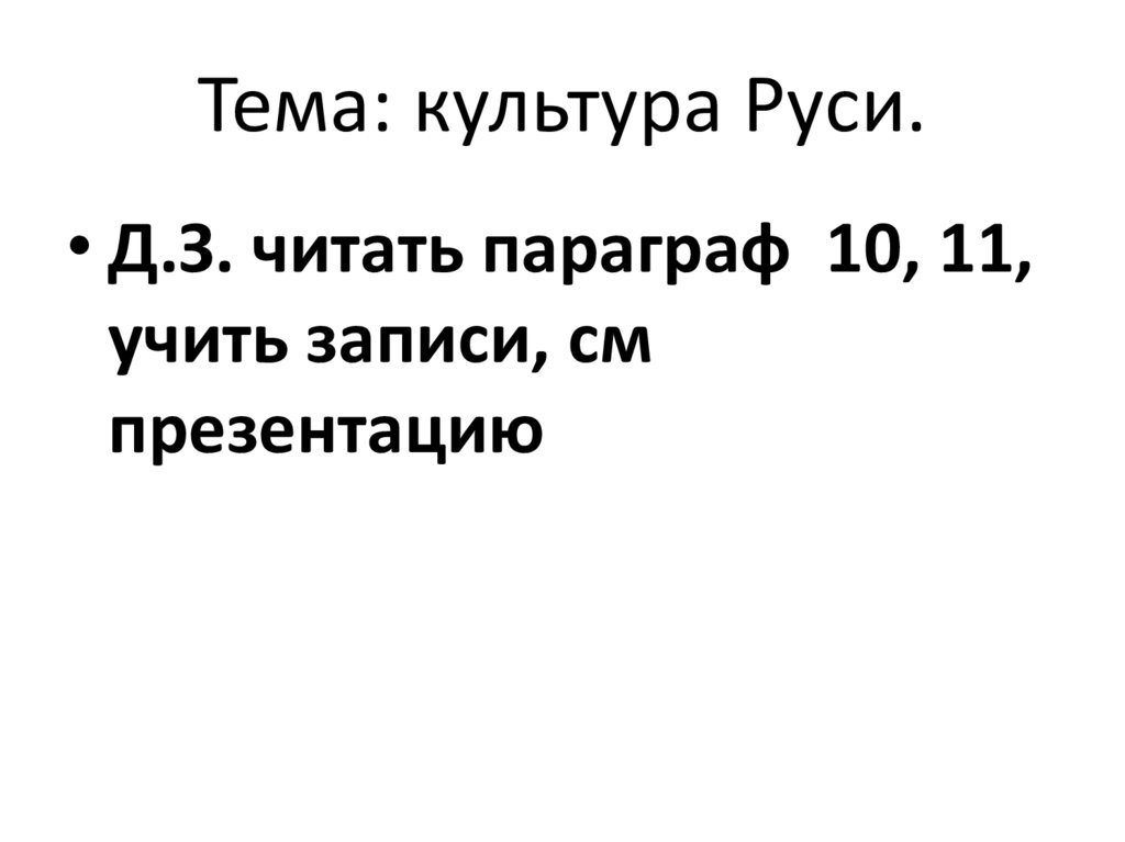 Тема: культура Руси.• Д.З. читать параграф 10, 11,