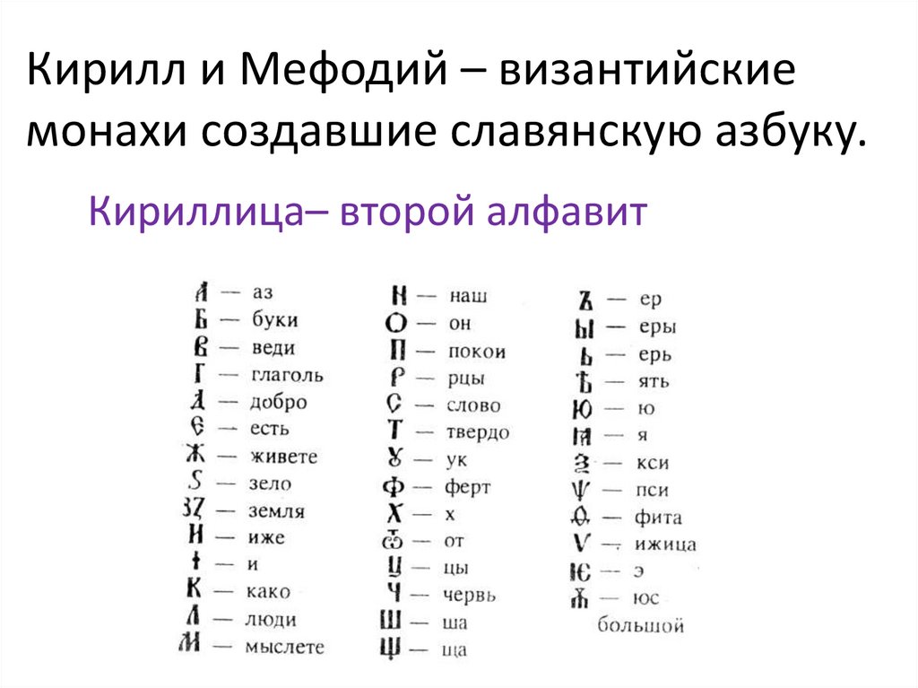 Кирилл и Мефодий – византийскиемонахи создавшие славянскую азбуку.