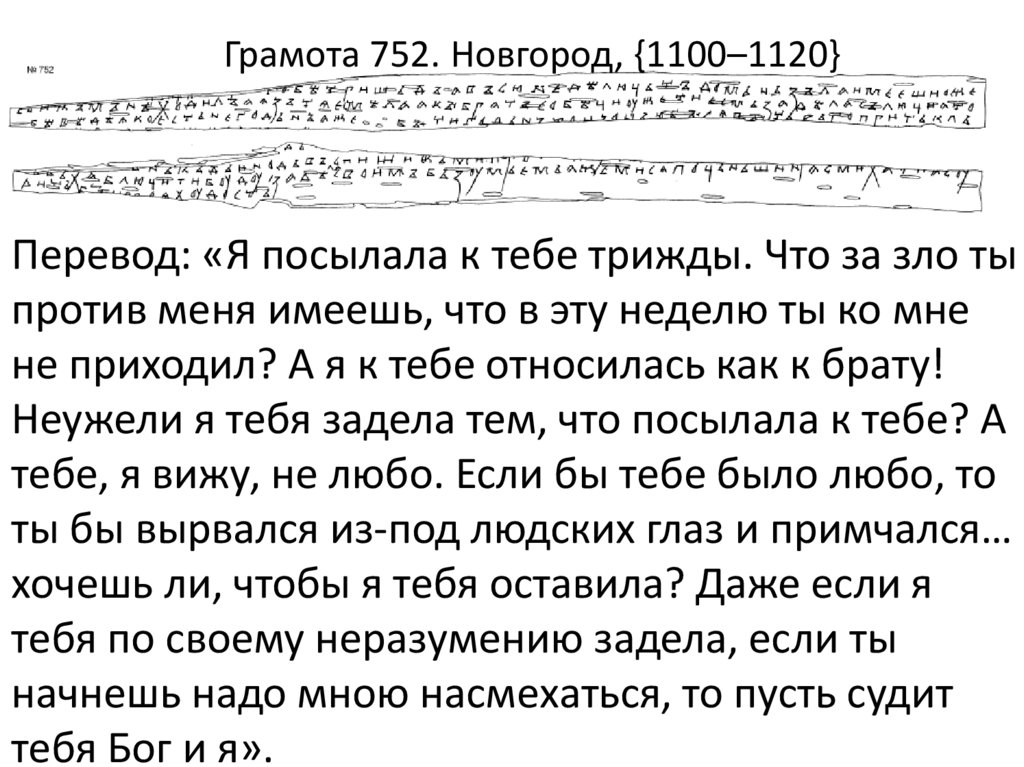 Грамота 752. Новгород, {1100–1120}Перевод: «Я посылала к тебе трижды. Что за зло ты