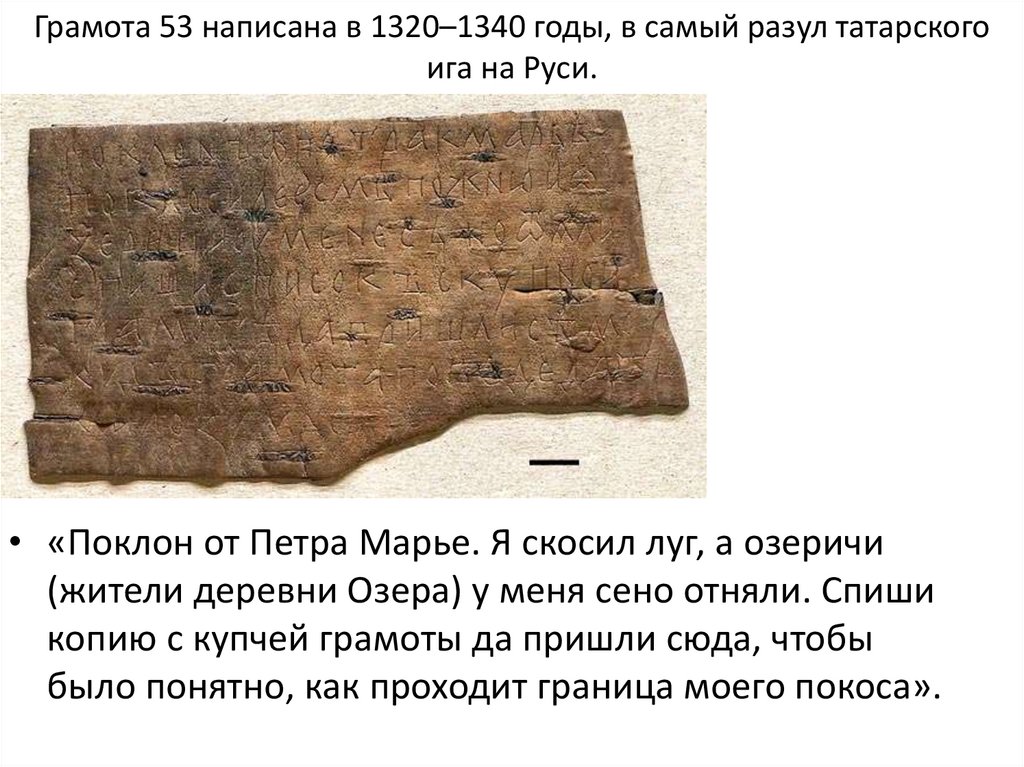 Грамота 53 написана в 1320–1340 годы, в самый разул татарскогоига на Руси.